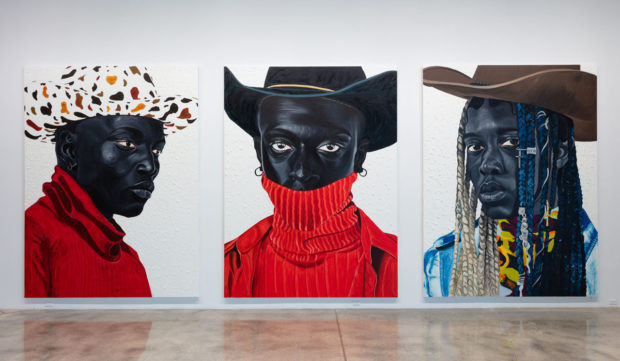 Ghanan painter, Otis Kwame Kye Quaicoe is a Rubell Museum Artist-in-Residence–which is one of the two galleries showing his work at Art Basel. Known for creating captivating portraits of his family and friends, Quaicoe uses color and texture to express the deep character of his subjects. The three featured works (above) convey a new perspective of the American cowboy trope.