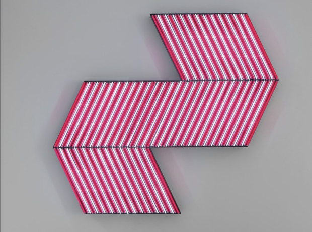 Since the 1960s, Lavier has explored the relationship between painting and sculpture, representation and abstraction. Often using a tongue and cheek attitude in his art, Lavier is known for using everyday industrial objects and repositioning them as elements in a strategic critique of consumerism. That being said, his untitled neon works (above) are a detour from his readymade work. Instead, the work pays homage to painter Frank Stella and traverse his fascination with time and space.
