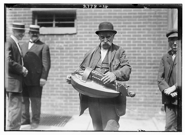 The Library of Congress doesn't seem to know much about this image other than the fact that it "shows a street musician playing a hurdy-gurdy." Street musicians have made money performing for the public since, as far as historians can tell, antiquity. This image is dated between 1910 and 1915.