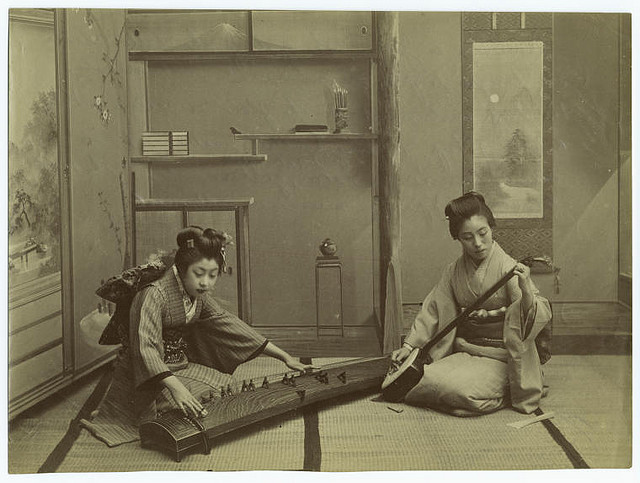 The New York Public Library doesn't offer a date for this image, but does give the description written on the original version: "B.M. Harcourt" "The girls of the [illegible word] classes are taught to play on musical instruments. The long instrument on the floor is called a koto, a kind of harp. The long handled instrument is called samisen, or native 3 stringed guitar, and is the most popular of Japanese musical intruments."