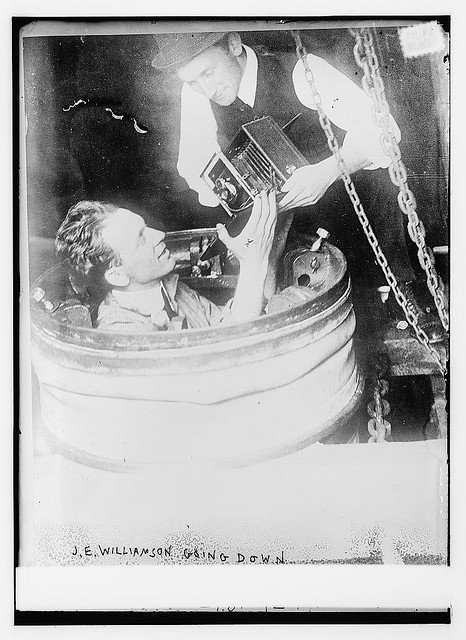 Underwater photography is pretty easy now, but it didn't used to be. This photo, from the LOC's Bain News Service collection, featured a title written right on the negative, which read "Photo shows John Ernest Williamson (1881-1966), pioneer of undersea photography, entering his "photosphere."