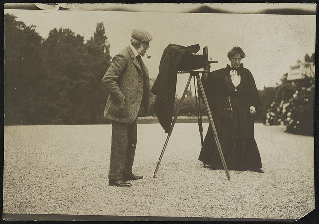This image comes from the Frances Benjamin Johnston Collection, via the Library of Congress, who have the following note attached: "Photograph shows photographer Gertrude Käsebier, standing next to a tripod-mounted camera, an unidentified man is standing behind the camera." Käsebier was an extremely influential American photographer, photographing Native American families, and especially mothers, in the early 19th century. You can read more about her here.
