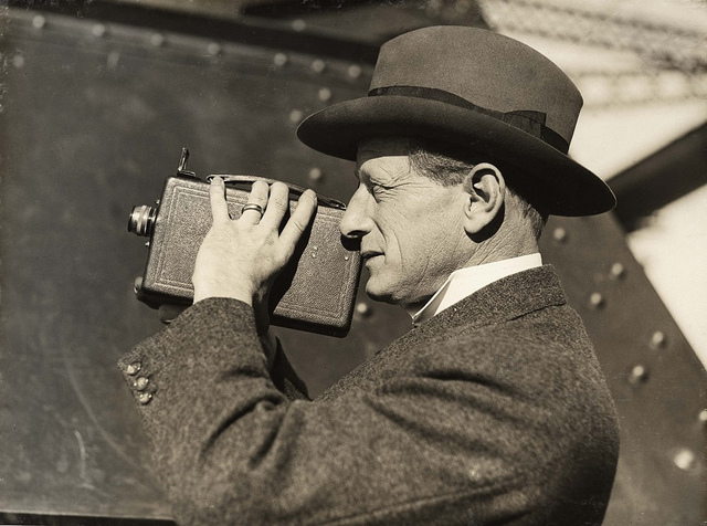 This image, from the State Records of New South Wales, features Mr Ralph Freeman at the Sydney Harbour Bridge in 1913. Freeman was a structural engineer who designed the bridge, so in all likelihood, he's not actually taking a picture in this picture, but rather, surveying the landscape. Still, it's a good photo.