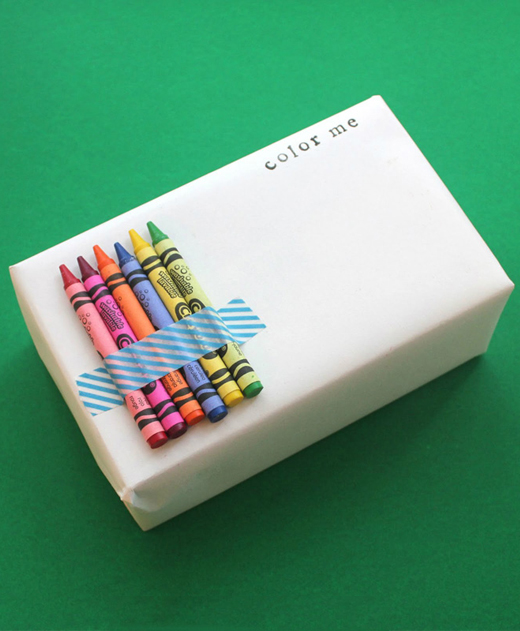 13. Create-Your-Own Crayon Paper. Have some little ones itching to tear open their presents? Wrap your gift in white paper, attach some crayons, and have them design their own package.