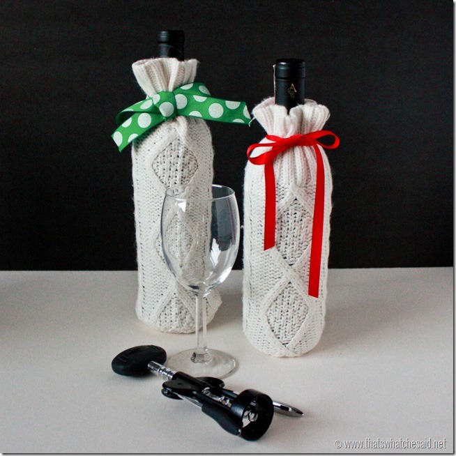 21. Sweater Sleeve Cozies. Nothing says warm and comfy quite like a sweater. Have any worn-out sweaters? Recycle an old Sweater Sleeve and make a fall-perfect cozy wine bottle wrapping.