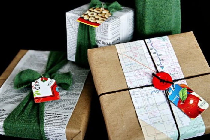 8. Upcycled Newsprint, Paper Bags, and Maps. Before you throw those old newspapers, paper bags, and maps into the recycling bin, consider incorporating them into a thrifty, unique wrapping design. In her Make post, Vanessa Coppola offered the excellent tip of using a low-heat iron to smooth out the wrinkles.