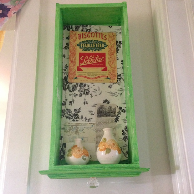 A recent visit to a home furnishings thrift store left me pondering all the possibilities of discarded parts, like this drawer. There it sat, without a chest, and I wondered what could possibly become of it. An afternoon later, after sanding, priming, painting and collaging it, the drawer had become a shelf and part of my kitchen decor. I even found a pretty glass knob to finish it off before making it the latest in my collection of quirks. With my grandparents' old salt-and-pepper shakers there to give it purpose and an old French advert found at a Parisian flea market to give it sentiment, it's a much-loved piece with a story or two to tell.