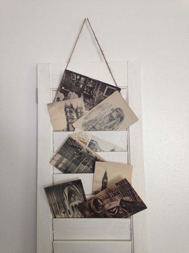 Another perusal around the resale store and I happened upon some shutters I knew I could repurpose somehow. Upcycling these shutters took no time at all. I strung some twine through the vents to let it hang from a nail, and now it's sitting pretty in my home office. Though it could be used for mail, photographs, or cool flyers, I found the shutter to be the perfect spot for these vintage postcards I found one day during a dig at a thrift store. They're all from England and date back nearly a hundred years, and they add just the right quaint touch to this old shutter -- not to mention the ideal ambience for this nostalgia obsessive.