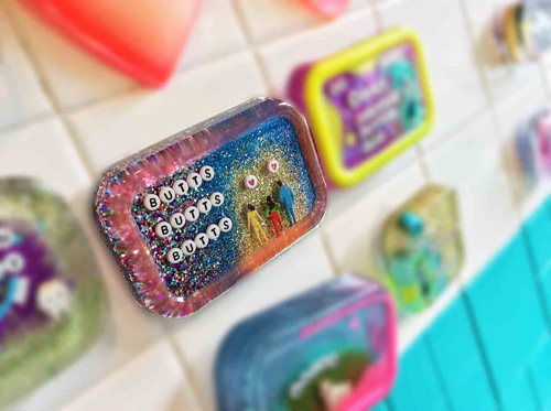 Shower Art - waterproof art you can hang in your shower with a suction cup. They are made out of rubber, glitter, discarded toys and a fair amount of sarcasm. Popular Shower Art themes become prints, stickers, postcards, shirts, hoodies, tank tops, magnets, buttons (and on and on).