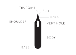 The nib, which is pictured to the left, also has distinctive parts, and knowing the lingo can be extremely helpful when, later on, you're trying to figure out the exact tool you need.