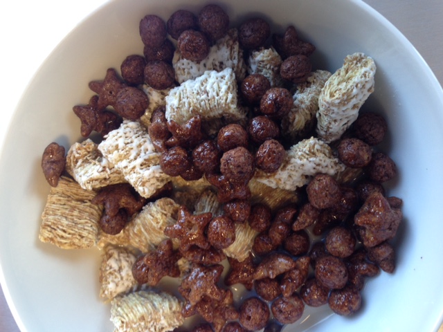 Stacie: At work I had been doing Cinnamon Toast Crunch with Cheerios which sorta makes Cinnamon Cheerios. Others I like to mix are Mini Wheats with Honey Bunches of Oats.