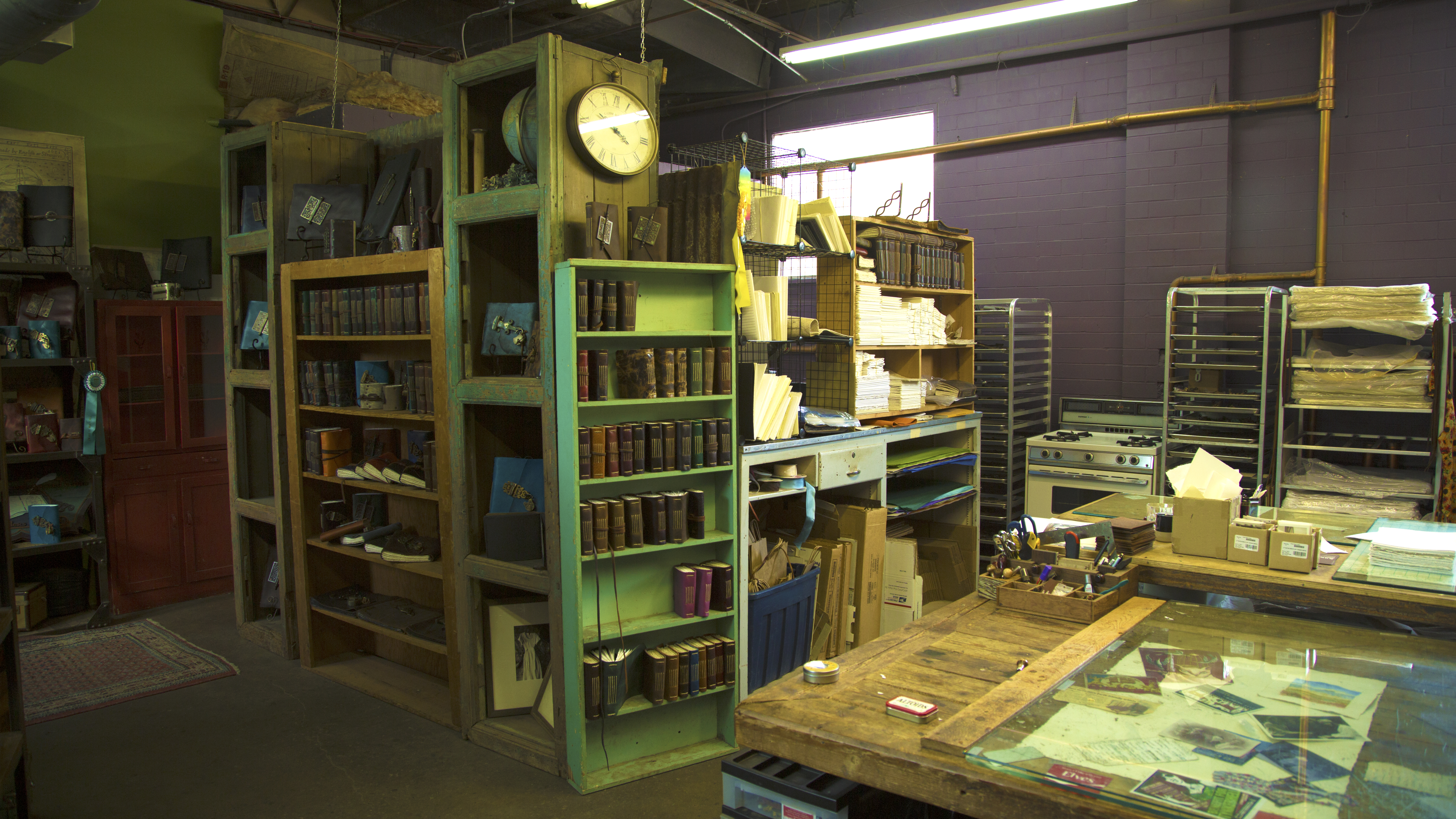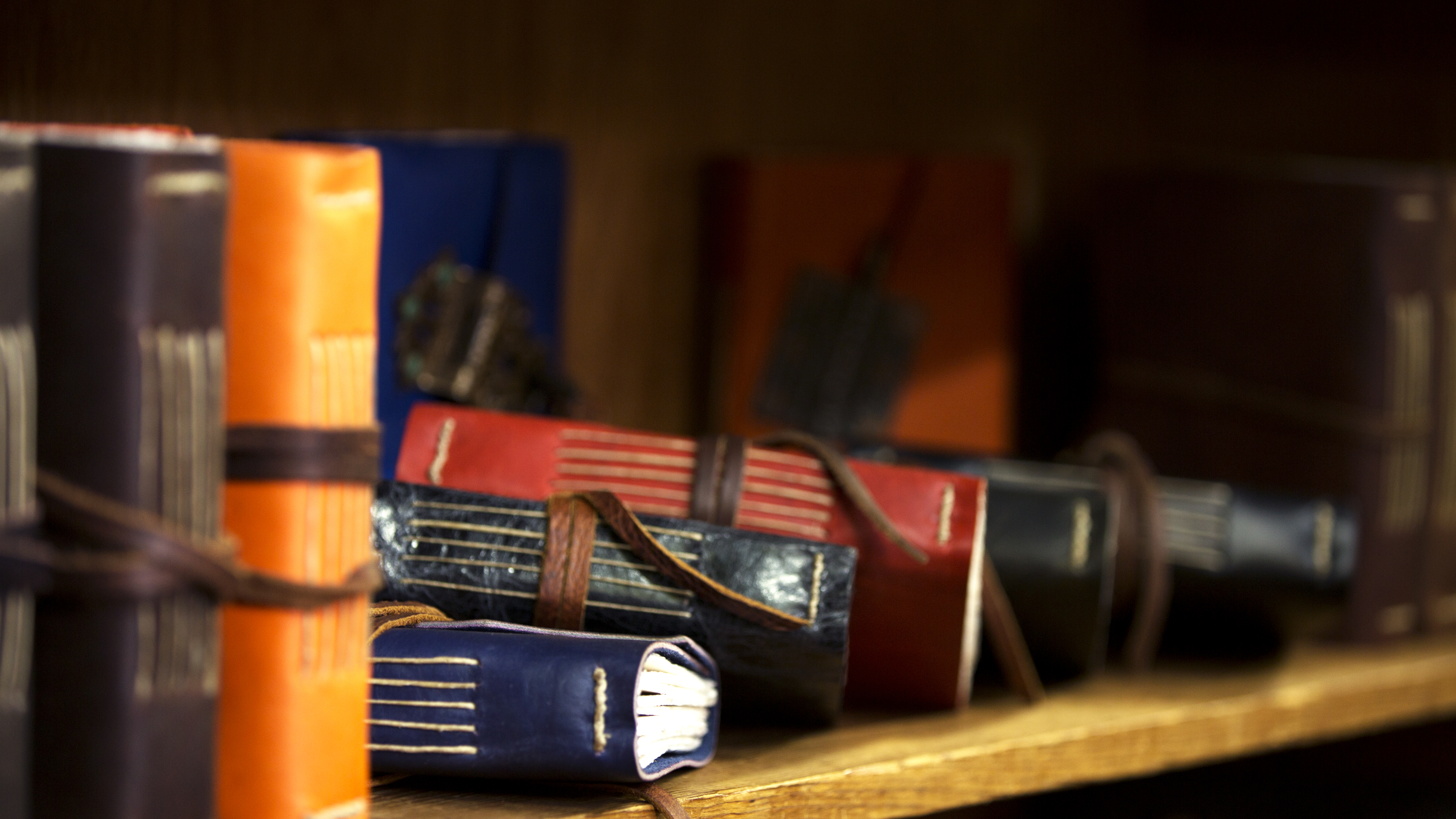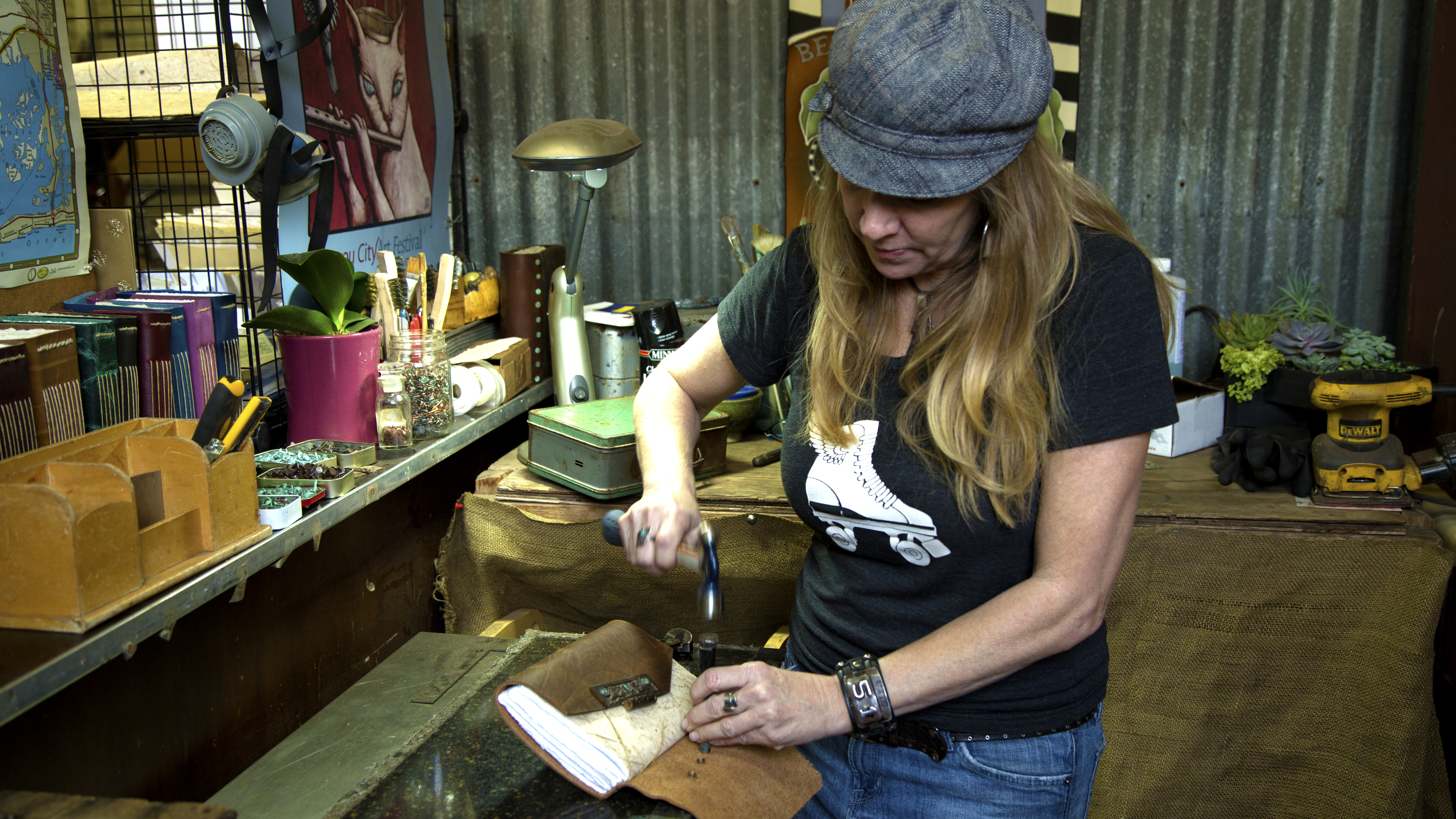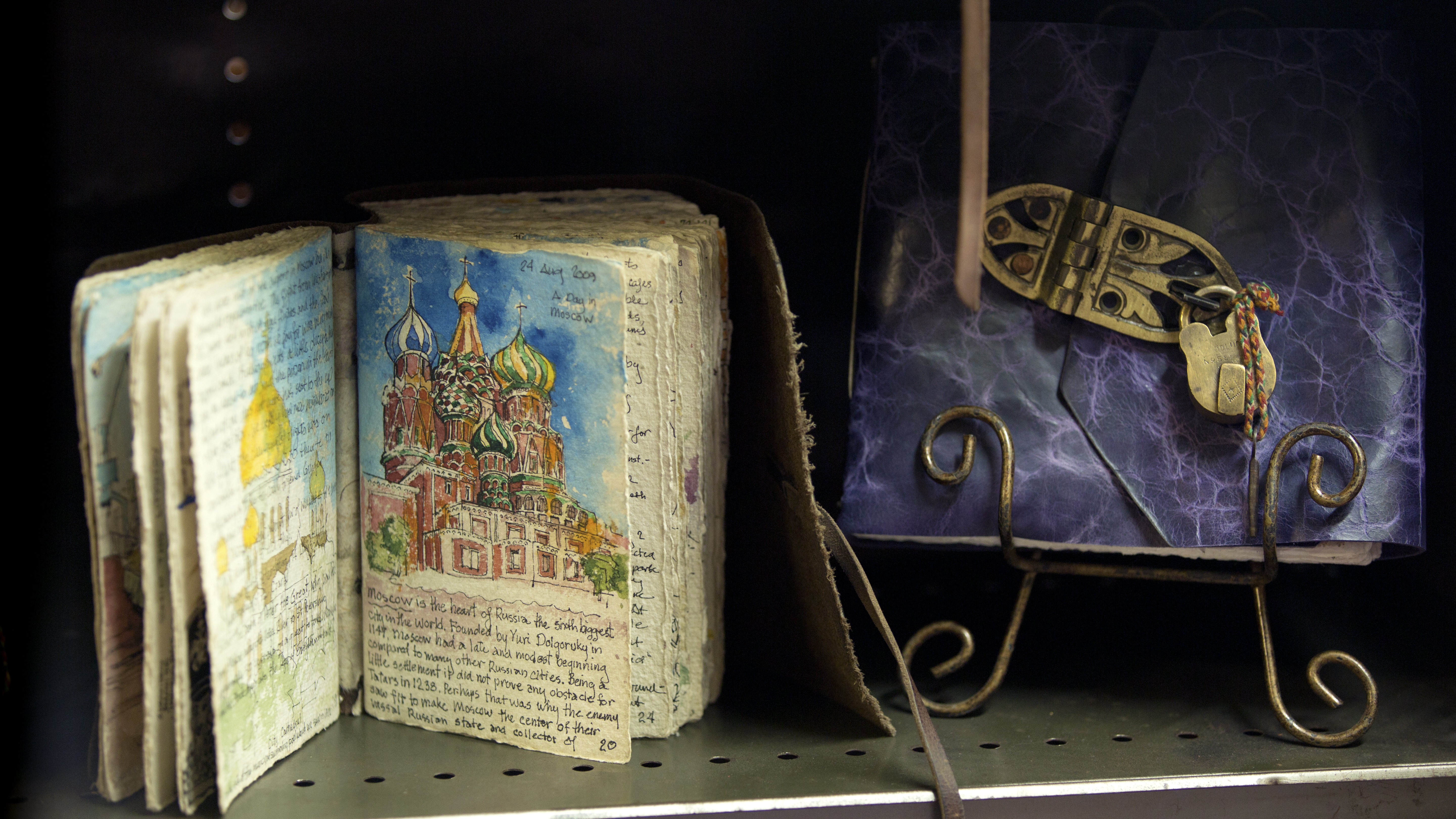 Her Austin, Texas workspace has a small retail area in front, where you can choose from a number of books that are already created. They range from simple leather wrapped with a cord to the fancier ones with treated metal hardware to lock your secrets away from prying eyes.