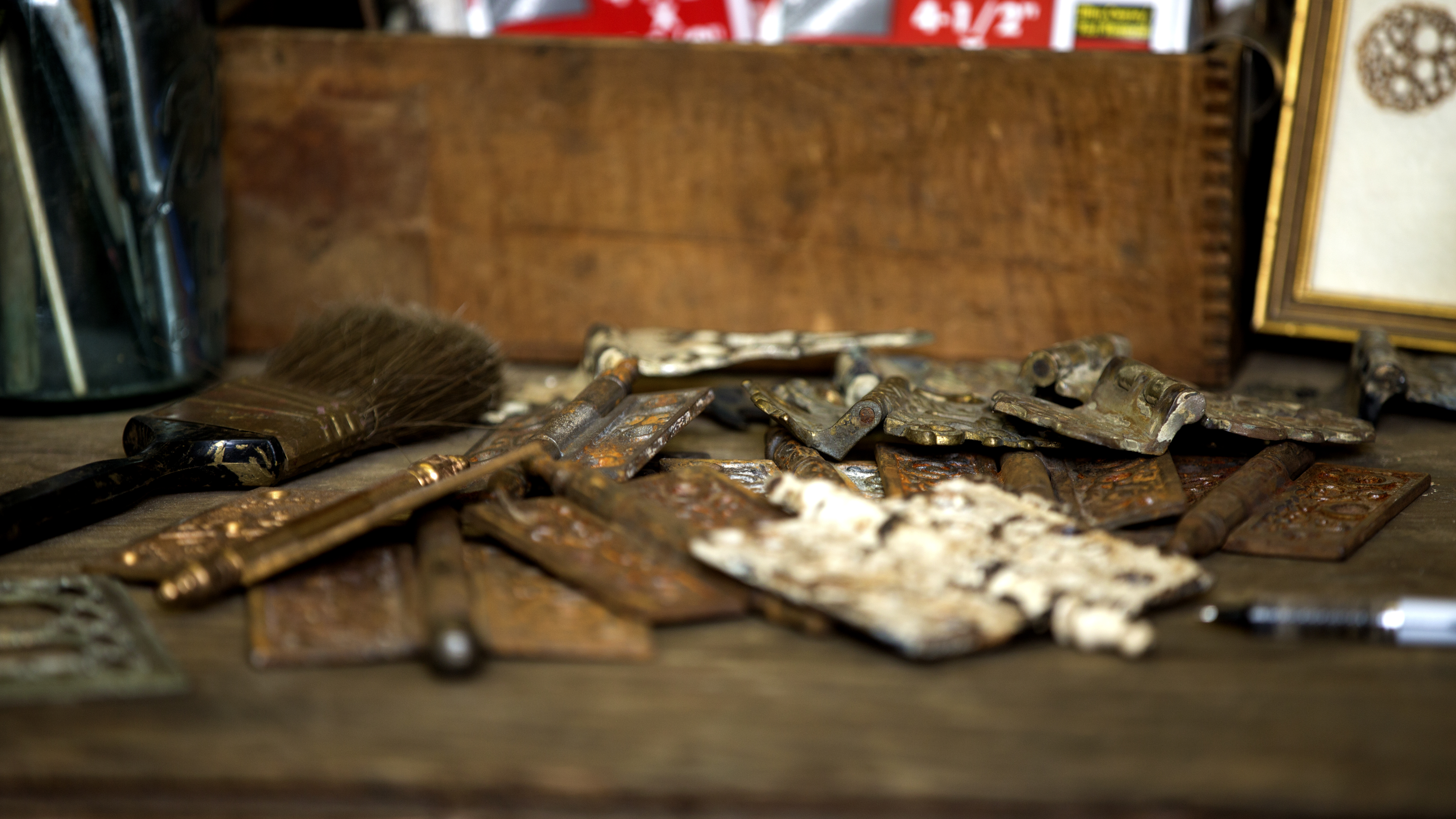 Mychal travels to second hand markets to find icebox hinges, doorplates, keyhole covers, and other intricate metal hardware fastenings to decorate her books.