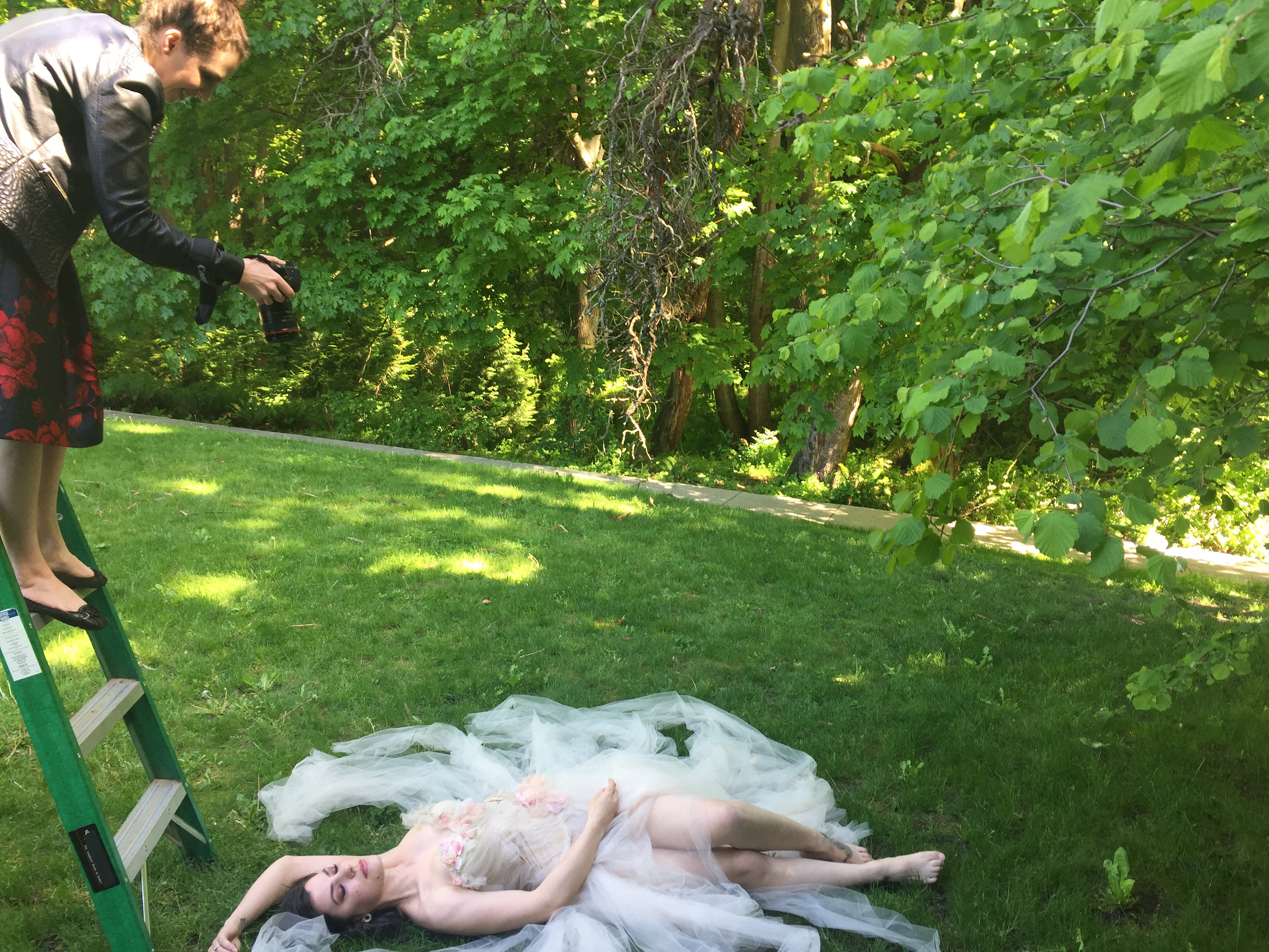 I stood a couple rungs up on the ladder, using a Canon 5D IV and Canon 24-105, using the live view of my camera so I could frame up the scene properly. I placed my subject in the shade of a large tree to put her in open shade, giving me beautiful and even lighting across the scene.