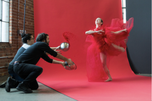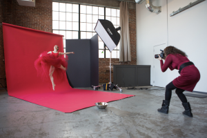 The subject was lit with a single softbox on a red background and using a dress made out of tulle.