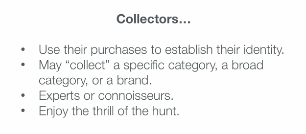 Collectors "don't always identify as collectors," she says. They're the kind of people, Megan explains, "are what you'd typically think of as experts or connoisseurs." Collectors, she says, "enjoy the thrill of the hunt," and they want to talk about it. If you have a product that can interest collectors, they will provide excellent word of mouth -- and often spend a little bit more.