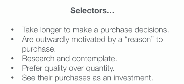 Most people want to take their time when shopping, and they want an outward motivation to purchase. This isn't a person who shops impulsively -- they need a reason. If you appeal to Selectors, a smart marketing campaign might be one that really delivers a reason to buy, like highlighting a holiday or an event.