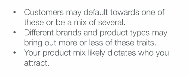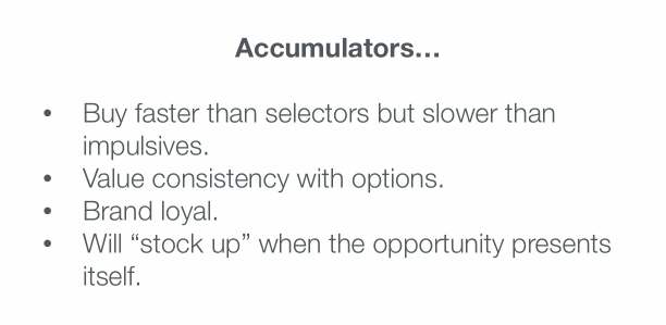 Accumulators love a sale. If you've got a great deal on some of your products, that's when the accumulators will come out and buy more than the average shopper. That said, they're also very loyal to the brands they like, so if you discontinue something they were hoping to buy again, they might get frustrated. To appease the Accumulators in your buying audience, it's smart to keep a pretty evergreen line of staples.