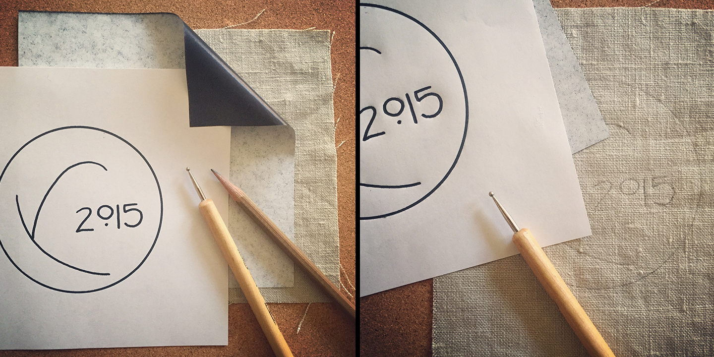 Trace the pattern using either a sharpened pencil or a stylus. Press firmly and trace the pattern lines a few times just to insure a strong transferred image. Once finished, peel back the tape, remove the pattern and carbon paper to reveal your image transferred onto your fabric.