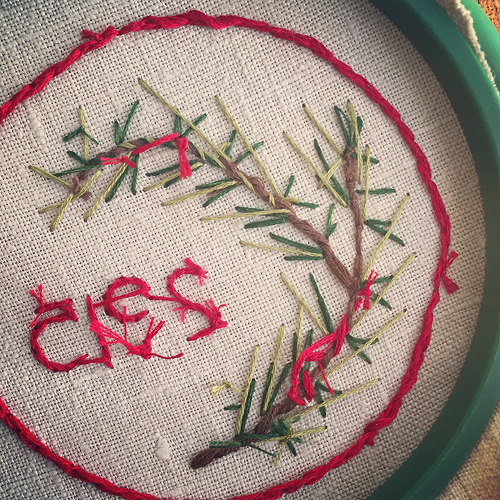 7. Consider completing your pine branch with a series of french knot berries! Again, the berries are not denoted on the pattern, allowing you to select the placement and number. French knots are feared by many, but here’s a fool-proof method to follow. Need a little more visual reinforcement? Here’s a french knot video tutorial I created, again with the talented Jenny Hart: