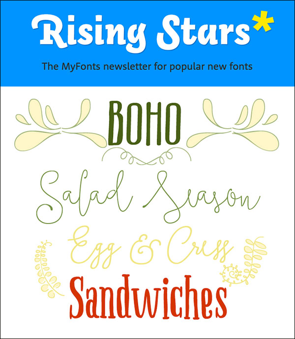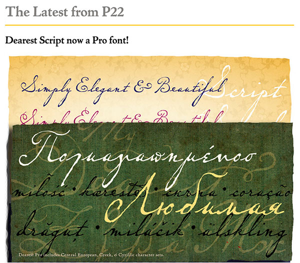 One of the best ways is to sign up for the mailings and promotions of reputable font sellers. Most major foundries and resellers send out newsletters and announcements on a regular basis. These are usually well-designed vehicles that showcase new releases in appealing, design-appropriate ways. They often include background on the typeface and the designer, as well as suggested usage. Some mailings include font promotions, current best sellers, interviews with designers, and other informative and entertaining articles; some even offer free fonts for signing up. Smaller foundries and resellers will usually send out mailings only when they have a new release or other important announcement.