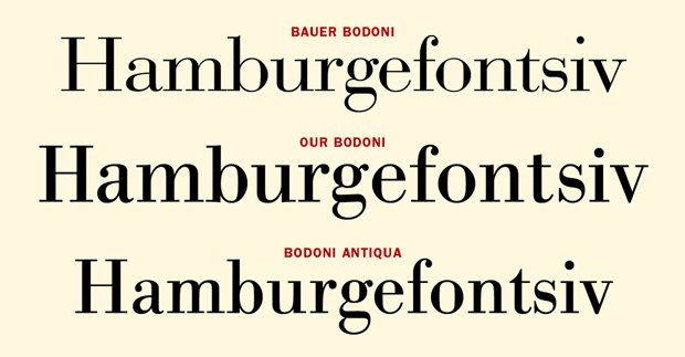 Three distinctive Bodoni typeface designs; they have similar foundations, but are different interpretations.[/caption]