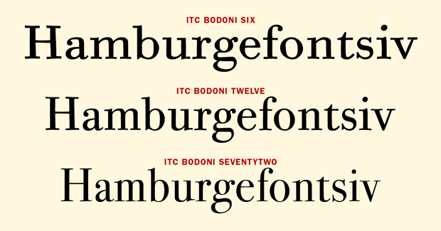 The ITC Bodoni family is a series of three size-specific designs intended to work well together. These pre-date today’s optical fonts.[/caption]