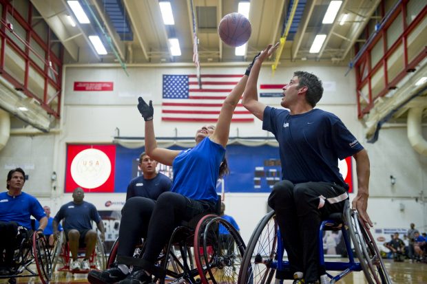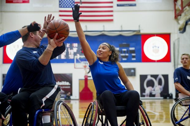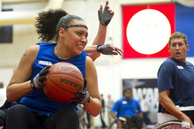 Air Force wheelchair basketball athlete, Jennifer Stone, prepares to pass the ball to her teammate during the Warrior Games held at the Olympic Training Center in Colorado Springs, CO, on May 11, 2010.