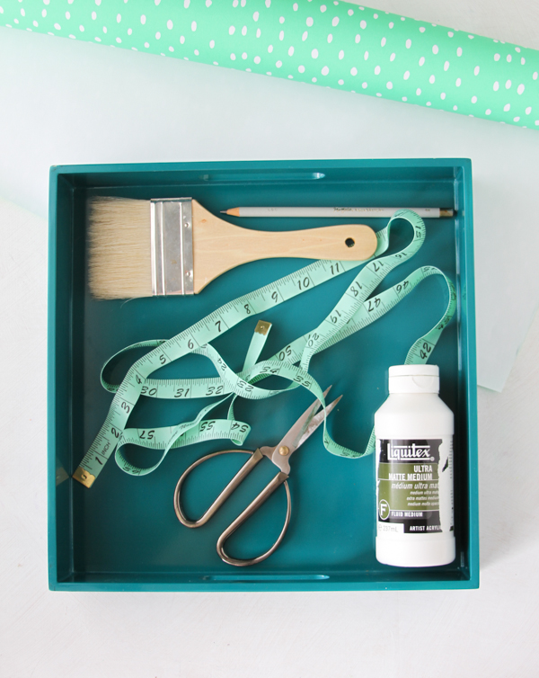 Serving Tray (I bought mine on sale at West Elm) Matte or Gloss Medium (I used Liquitex brand, which is non-toxic) Paint Brush Decorative Paper (or make your own!) Scissors Measuring Tape and/or Ruler PencilSupplies: