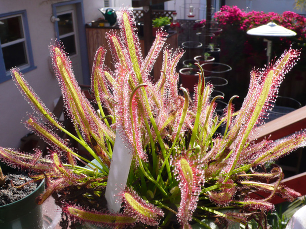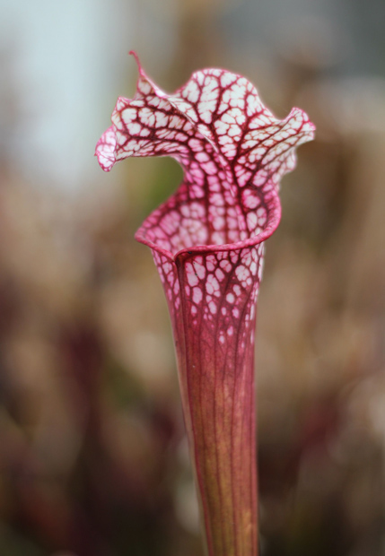 You can find a wide variety of these bug eaters in plant stores and home improvement centers. For specialty carnivorous plants, there are LOTS of passionate growers online. While they all grow well outdoors, most are showy in summertime. For an October display, look for Sarracenia leucophylla (pictured below, and a green variation, 'Schnell's Ghost' is pictured in the first image)) and Drosera capensis (pictured above). They, along with Dionaea muscipula (the Venus’ Flytrap) will still have freak appeal in the later seasons.