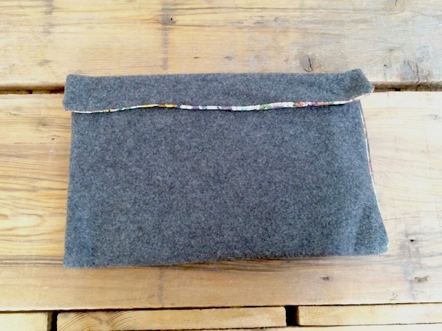 Now, fold the case in the middle (with the flap for the closure still free). You might want to do this around your device to make sure it still fits. This can also be a good time to decide how closely to sew the inside seam. With the case inside-out, sew the seams on three sides (all but than the opening). This might give your machine a run for its money, since the material will be pretty dense at this point, so you may want to use a longer stitch length.
