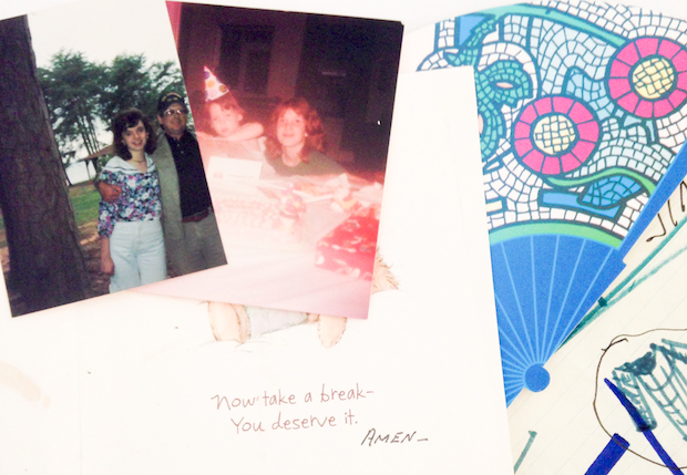 Then, I gathered those special things together: A piece of paper he’d written his name on while I played “school” with him when I was little; a photo of us with my sister on my fourth birthday; another pic of us when I was braces-faced teen; and a dried flower from his mother’s funeral. I also decided to add a beautiful postcard shaped like a fan I bought in Barcelona. I’d gone there once because he told me it was beautiful. And of course, the old graduation card was the prominent item for my new collage.