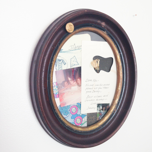 So, I found a pretty, old oval-shaped wooden picture frame that seemed perfect. It has some wear and tear, too, but that makes it even more endearing, in my opinion. Remember, you can also find a shadow box or convert an old drawer into a memento shrine. For my project, I chose mostly paper products, so this thrifted frame worked wonderfully.
