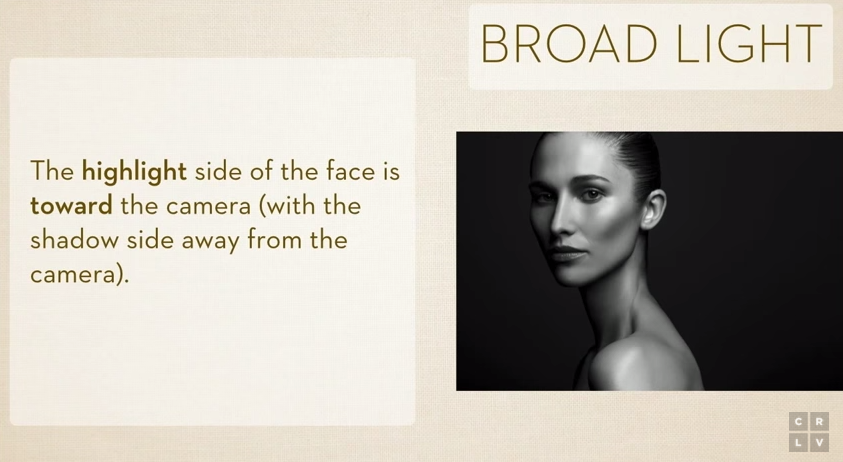 Broad light: Quite simply, says Lindsay, this term "means...that the shadow is going away from the camera." In an instance of broad lighting, the shade is cast away from the camera. Your model is "broadly lit," Lindsay explains. This also makes your subject's face look broader.