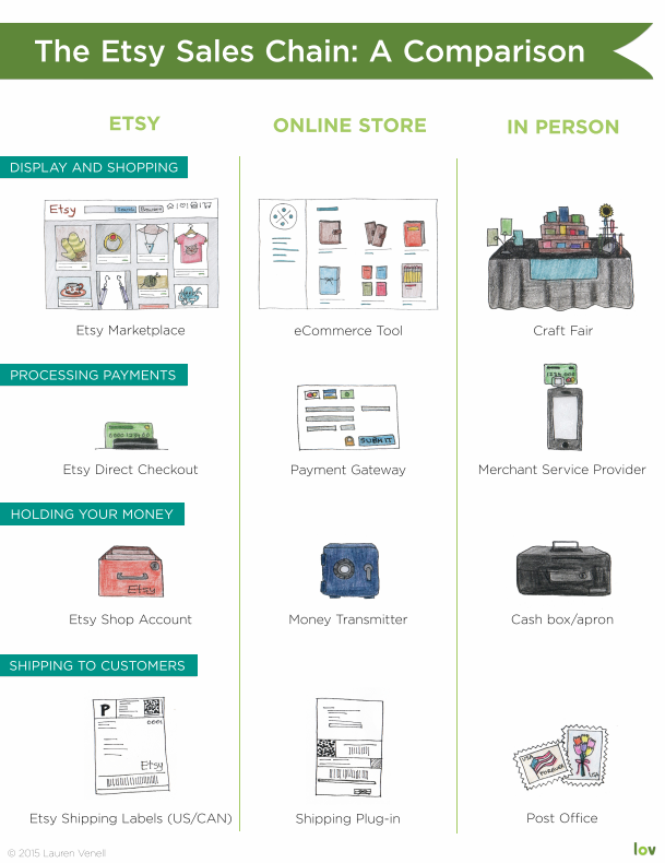 This end-to-end control is definitely a bonus for busy sellers and those who don't want to wrangle their own online store, but can also fuel a kind of detachment from the actual dealings of your store. To help illustrate the comparison, Lauren created this image:
