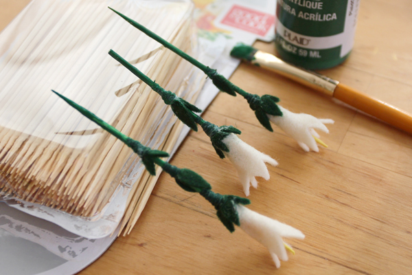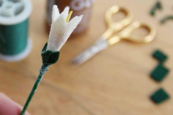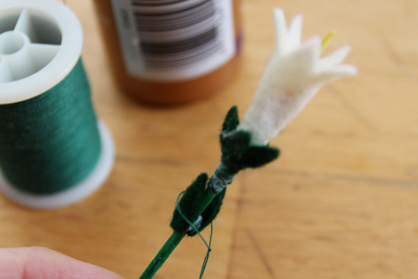 Glue 5-6 green leaves around the base of the white felt flower. Cut a 4-inch length of green thread, tie a slipknot in the thread and tighten it around the base of the felt leaves, then wrap the rest of the thread around the base of the leaves, and onto the painted skewer so that the felt tapers smoothly. Rub a dab of glue over the wound thread to hold it in place. Continue making as many or as few flowers as you like.