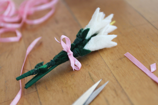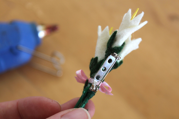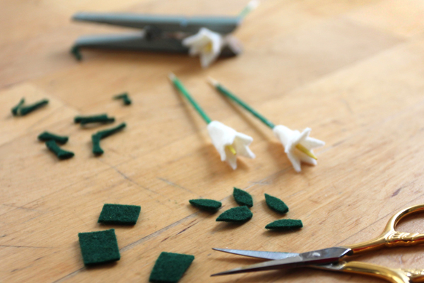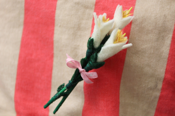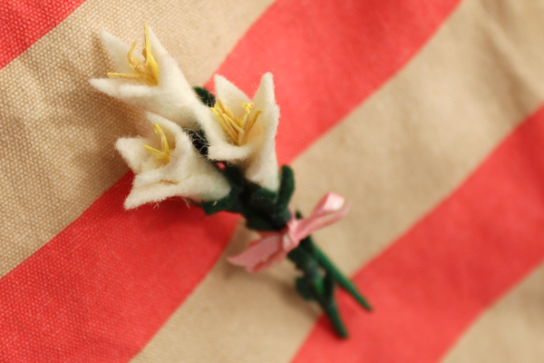 Felt, on the other hand, is a material that I’ve worked with forever and it has almost never disintegrated in the presence of small children (or unpredictable pets or drizzly days.) With Easter coming up, I wanted to make a trio of tiny felt flowers. Easter lilies seemed like the obvious choice for this crafty spring bouquet brooch.