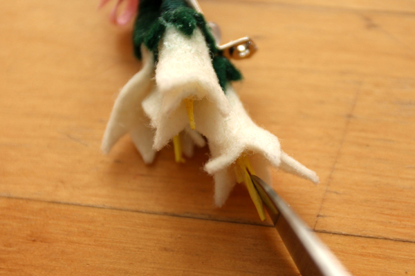 To create the spray of anthers within an Easter lily, take that sharp knife you used earlier, and carefully pierce the painted skewer end twice, then gently pull the wood so that it splays out. This step may seem risky, but being married to a botanist and having a green thumb myself, I was really bothered that my Easter lily had what looked like a single spadix (like that of a Peace lily)!