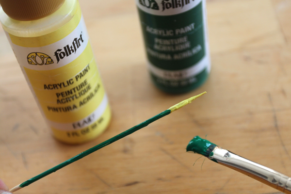 Paint the tip (about ½ inch) of your bamboo skewer yellow. Paint the rest of the skewer green. Let the paint dry completely.