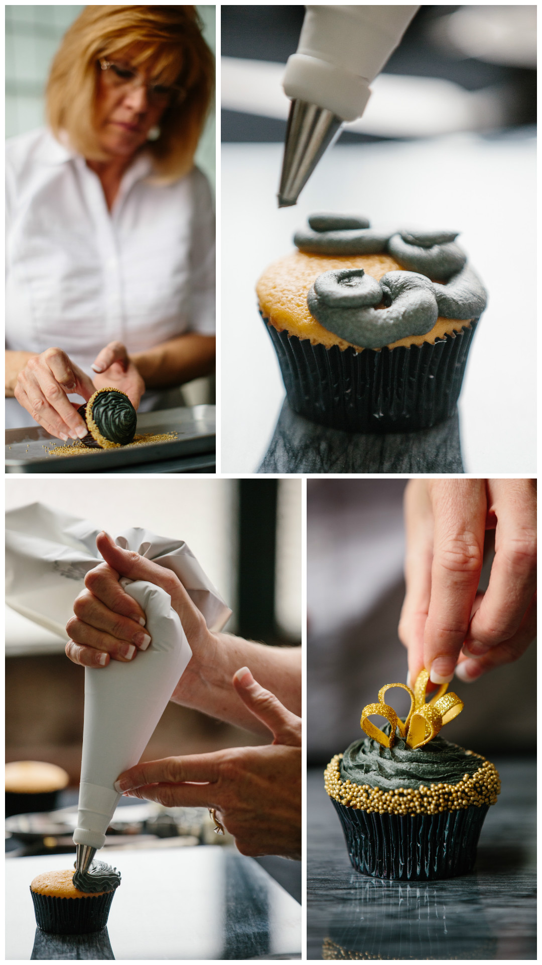 Lucinda used a black and gold color palette and edible glitter to create sophisticated cupcakes that would fit right in at a cocktail party. The gum paste bow is a subtle nod to the holidays and the snowflakes add some serious seasonal sparkle.