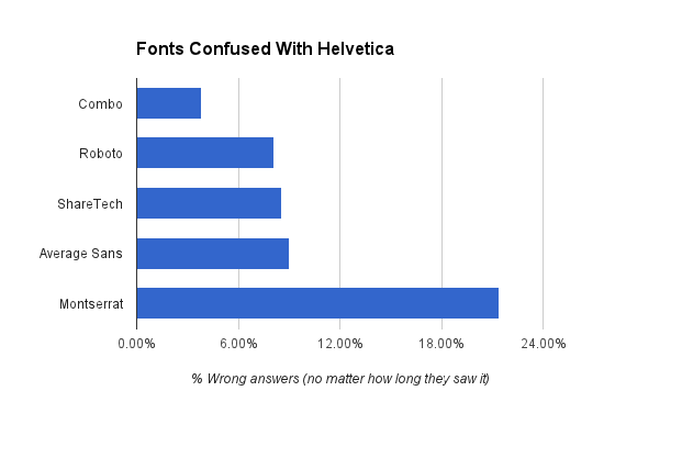 You tell me. First, look at this graph showing the percentage of wrong answers by font. The data says that users most often confused Montserrat with Helvetica, and the font Combo, less so.