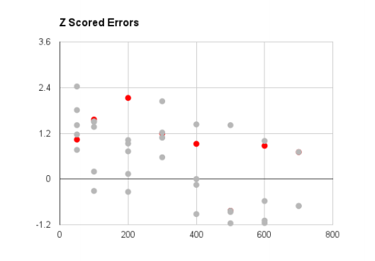 Z Scoring is basically taking data and fitting it to a bell curve. I did two things in the z score plot above: 1.) fit the percentage of wrong answers to bell curves by exposure time. 2.) highlighted the wrong answers where people saw the comparison Helvetica vs. Helvetica