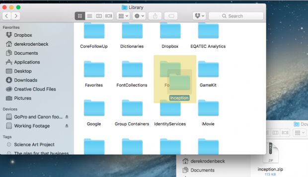 Step 6: Select the fonts files that were previously opened in a different window, (usually the downloads) and drag and drop them into the font folder in the Library window.
