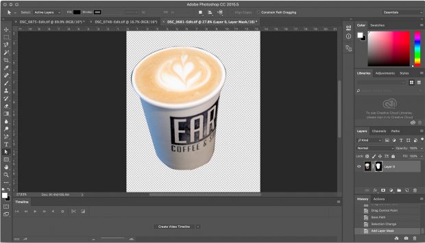 So far, all you’ve done is create an invisible path inside your photo. Next, you need to convert it into a selection. Back inside the Paths window, right click (or option click on a Mac) on the path you made and choose “Make Selection” from the dropdown options that appear. In the pop-up window, choose the feather radius, or how soft to make the edge. If you’re cutting out an object that has some edges out-of-focus, use a higher feather. Now, your path turns into a dotted line — the object you clipped out is now selected. From here, you can copy the selection to paste it into another file, or, you can add a mask for tasks such as removing the background. With the selection still highlighted, click on the layer that contains the object (simply called Background if you haven’t touched the layers yet), then click on the “Add Mask” icon in the bottom of the Layers panel, which looks like a rectangle with a dark circle inside. The mask will automatically be applied with the layer selection, removing the background. From here you can continue to edit the photo, adding a different background or continuing to refine the edge using layer mask tools.