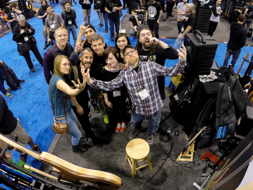 Ola with artists at .strandberg* booth, NAMM 2015; Photo: Courtesy of Ola Strandberg[/caption]