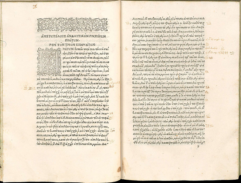 Page-spread from the Aristoteles "Opera" printed by Aldus Manutius about 1495—1498. Copy of the Bayerische Staatsbibliothek; Image via Wikimedia Commons[/caption]