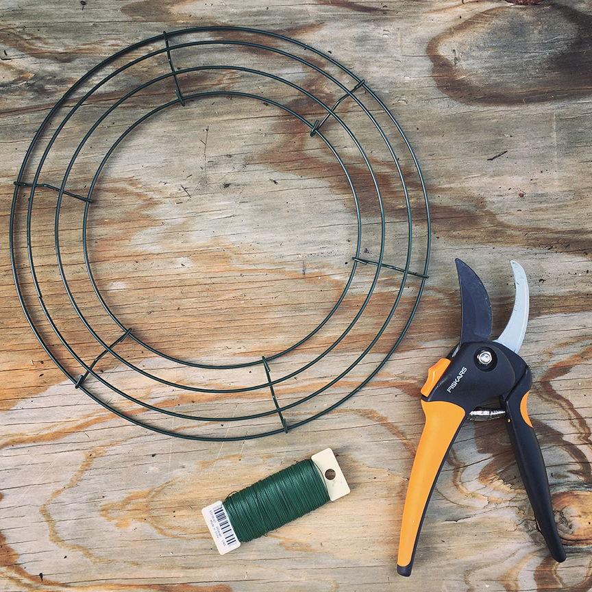 12” wire wreath form24 or 26 gage floral wireTools:Wire cutterPruning shears