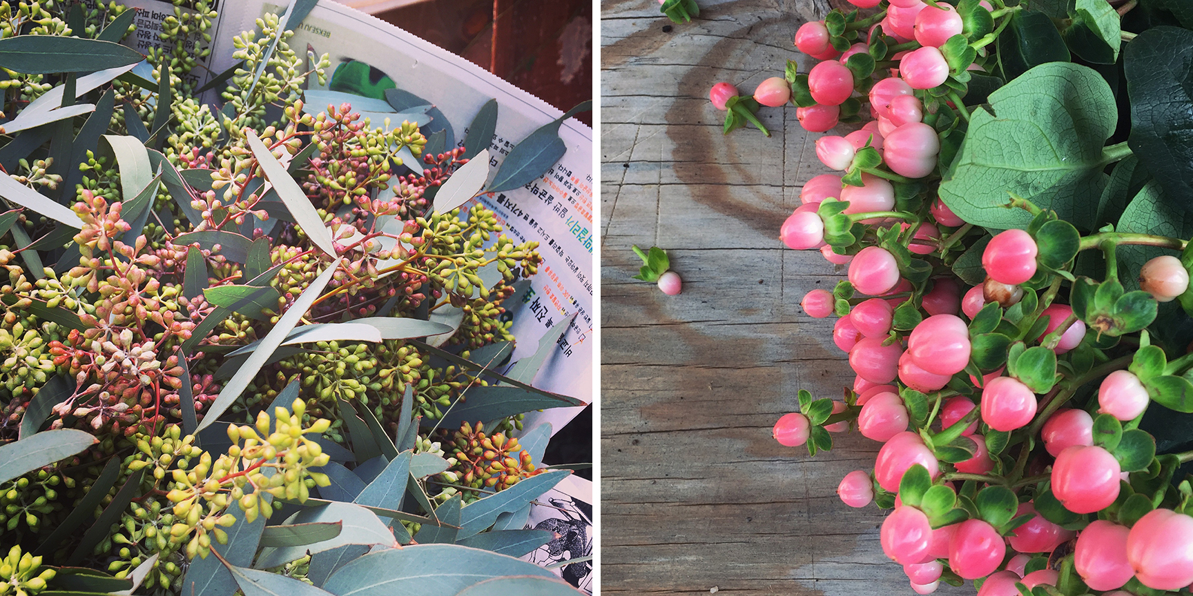 Check out the selection at your local florist or, if weather permits, you might consider foraging greens from your neighborhood. I took a field trip down to my local flower market and came away with three bundles of seeded eucalyptus and one bundle of beautiful coral pink coffee beans. Boxwood branches, lemon leaves, and magnolia trimmings would all make wonderful options! Given that these plants won’t be in water, opt for sturdier greens that won’t wilt in a day.