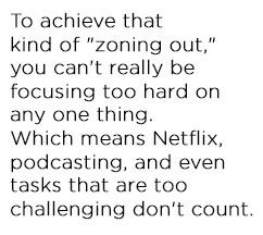 To achieve that kind of "zoning out," you can't really be focusing too hard on any one thing. Which means Netflix, podcasting, and even tasks that are too challenging don't count. The impact of daydreaming or true idling are "in sharp contrast to the pattern struck by the brain when hard at work: In this mode, introspection is suppressed while we attend to pressing business — we 'lose ourselves' in work," writes Healy, "As we do so, scientists see the default mode network go quiet and other networks come alive."