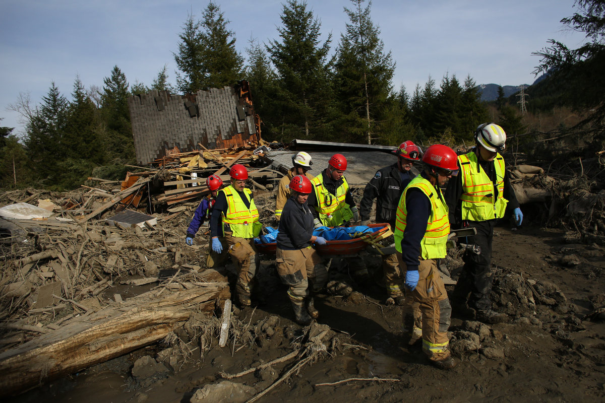 Rescue workers remove one of a number of bodies from the debris field of the Oso mudslide along the North Fork of the Stilliguamish River. (Joshua Trujillo, seattlepi.com)[/caption]